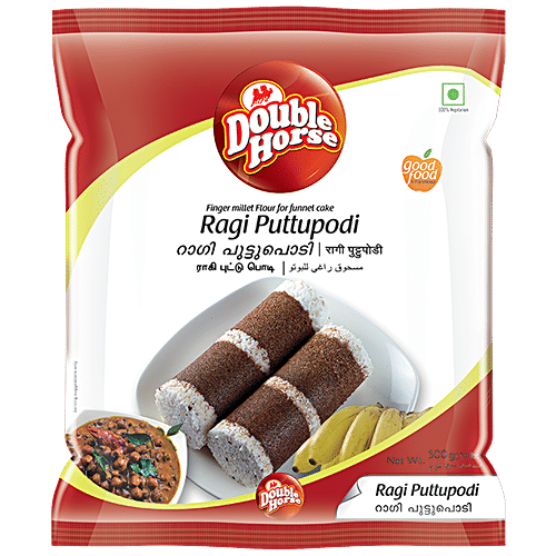 Ragi Puttupodi is made from good quality selected destined ragi. Processed with GMP standards, ragi contains important amino acids which are not present in other starchy meals. It only needs 3-5 minutes for steaming and can be served with plantain or curry or chutney or with sugar as well. A perfect breakfast item, with Double Horse you are more than sorted here. A 100% vegetarian product, now get the best finger millet flour for your funnel cake. Made from the finest quality ragi, now make healthy and comforting Puttupodi readily at home and with ease. To know more, explore our whole range of products! Benefits Ragi Puttupodi. Good food for your best choice. 100% vegetarian product. Made from 100% finest Ragi.